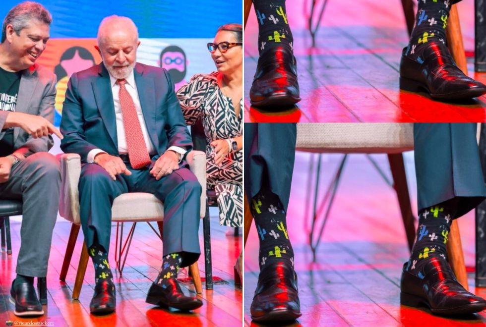 O presidente Luiz Inácio Lula da Silva chamou atenção ao deixar à mostra as meias escolhidas para um evento em Brasília, na noite de quinta-feira (14).