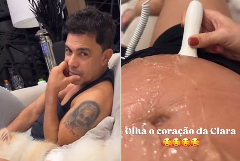 “Estou aqui testando o aparelhinho do ultrassom. Olha o coração da Clara. Que legal! Você mela com gelzinho e vai passando. Está ouvindo, amor?”, pergunta ela a Zezé, que acena com a cabeça falando que sim.