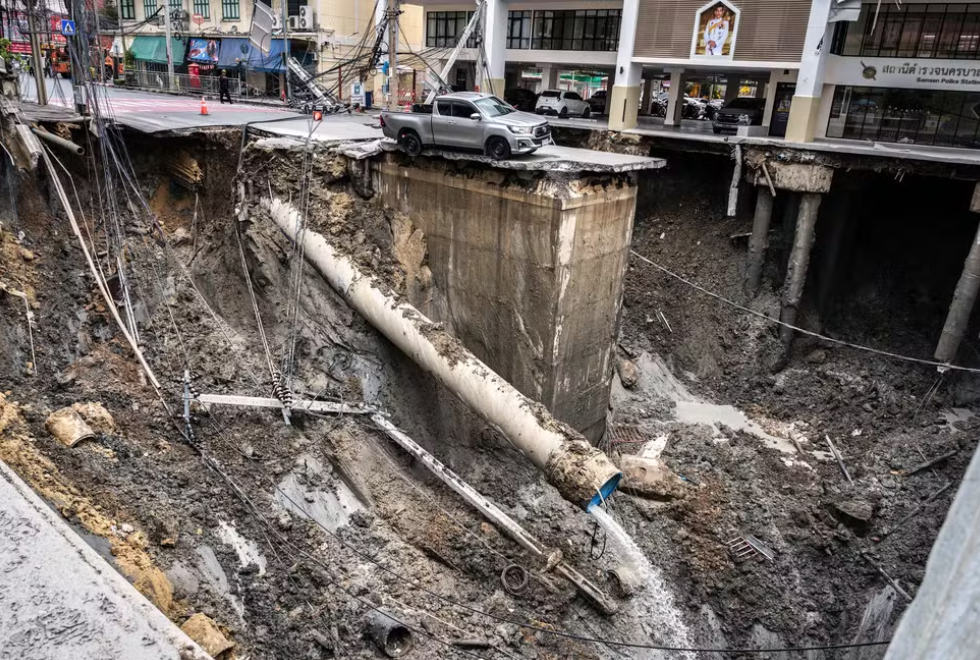 Uma cratera enorme de 50 metros de profundidade se abriu nesta quarta-feira (24) em uma avenida movimentada no centro de Bangkok, capital da Tailândia.